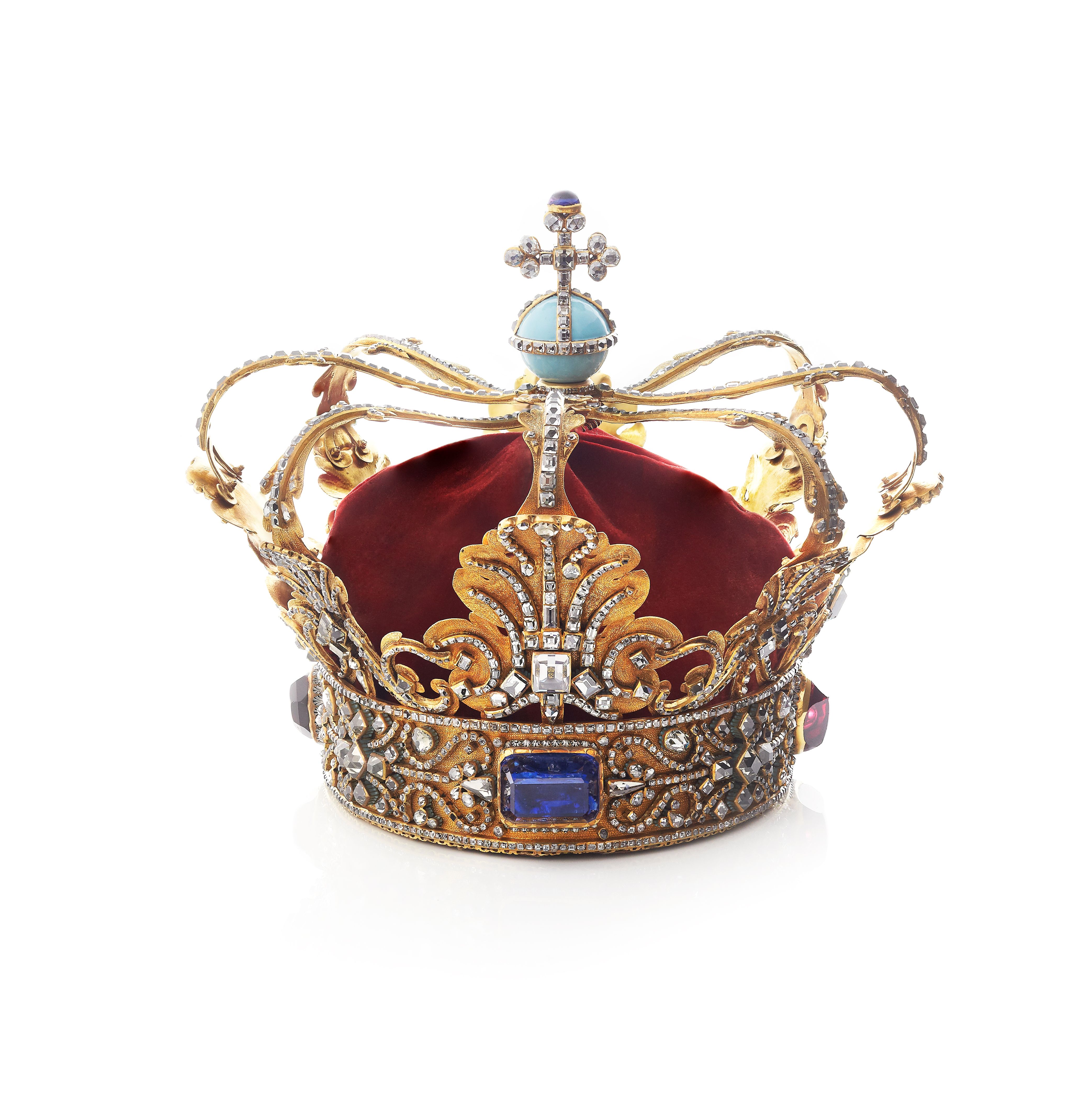 Foto øverst: Christian 5.s krone. Fremstillet til Christian 5.s kroning/ salving på Frederiksborg Slot i 1671. På kroneringen to meget store blå safirer og to røde granater.