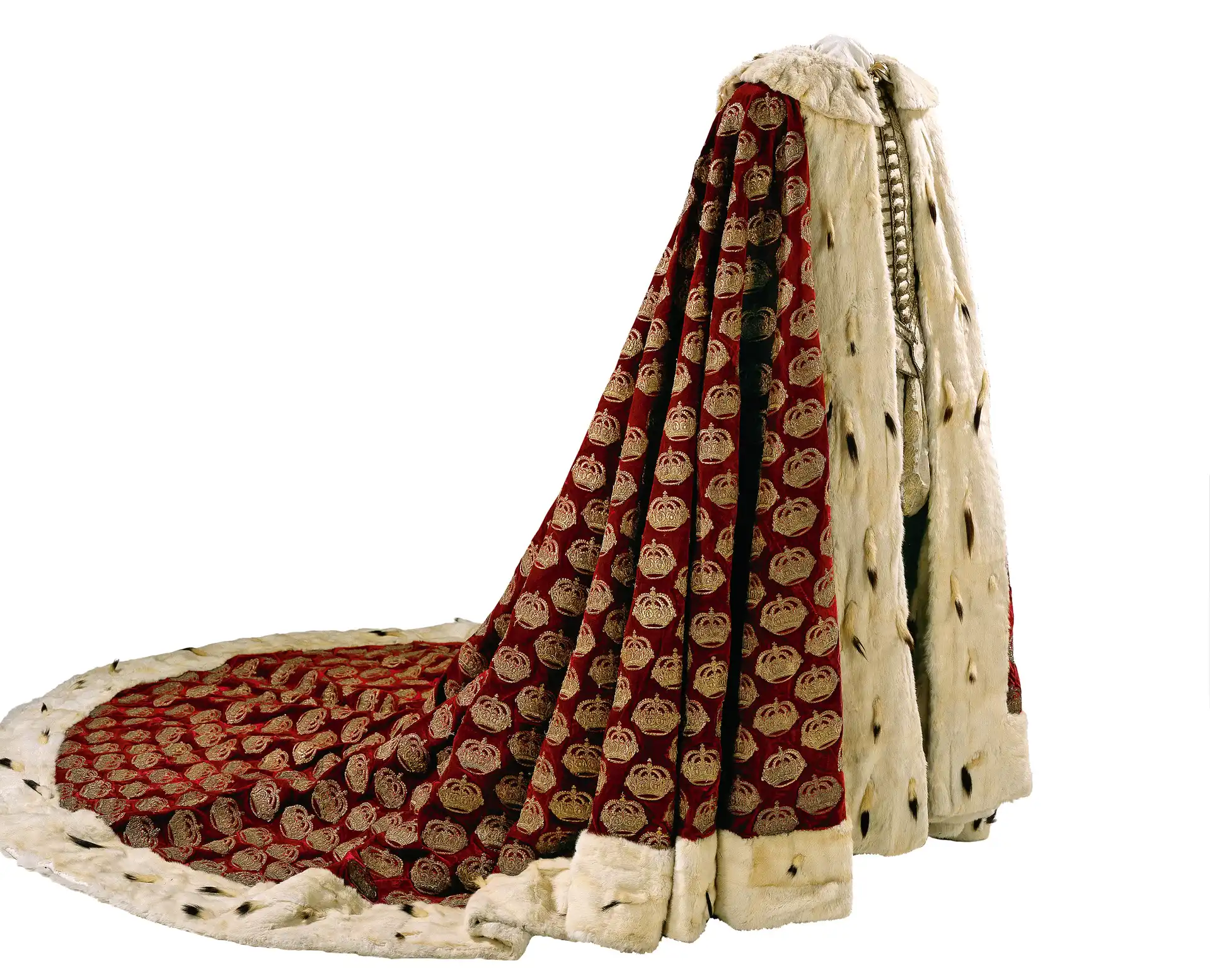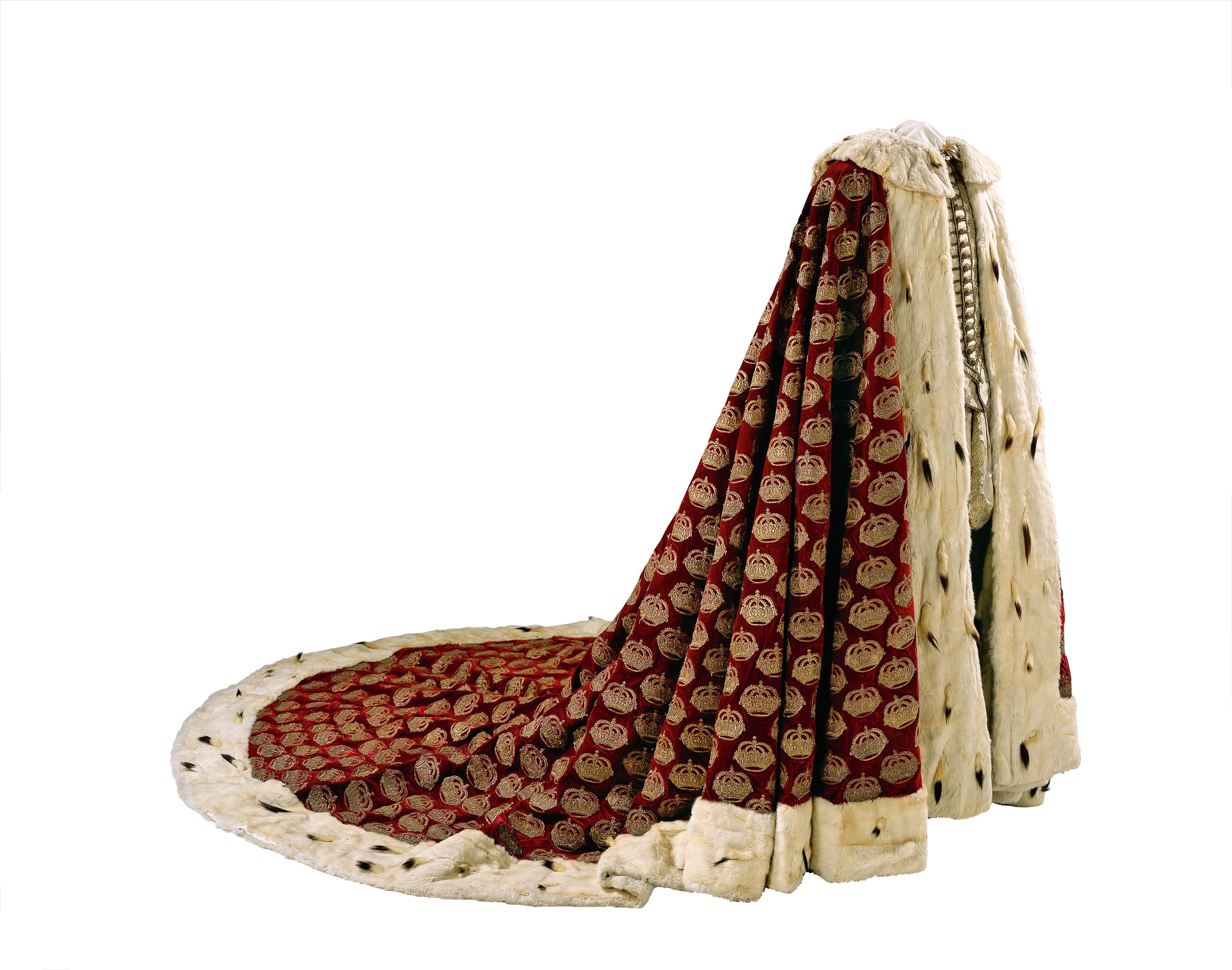 Christian 5.s salvingskåbe. Enevælden blev indført 1661, og da den første enevældige konge skulle indsættes i 1671, skulle der opfindes en helt ny ceremoni. Over salvingsdragten bar kongen en lang kåbe af mørkerødt silkefløjl. Foto: Iben Kaufmann