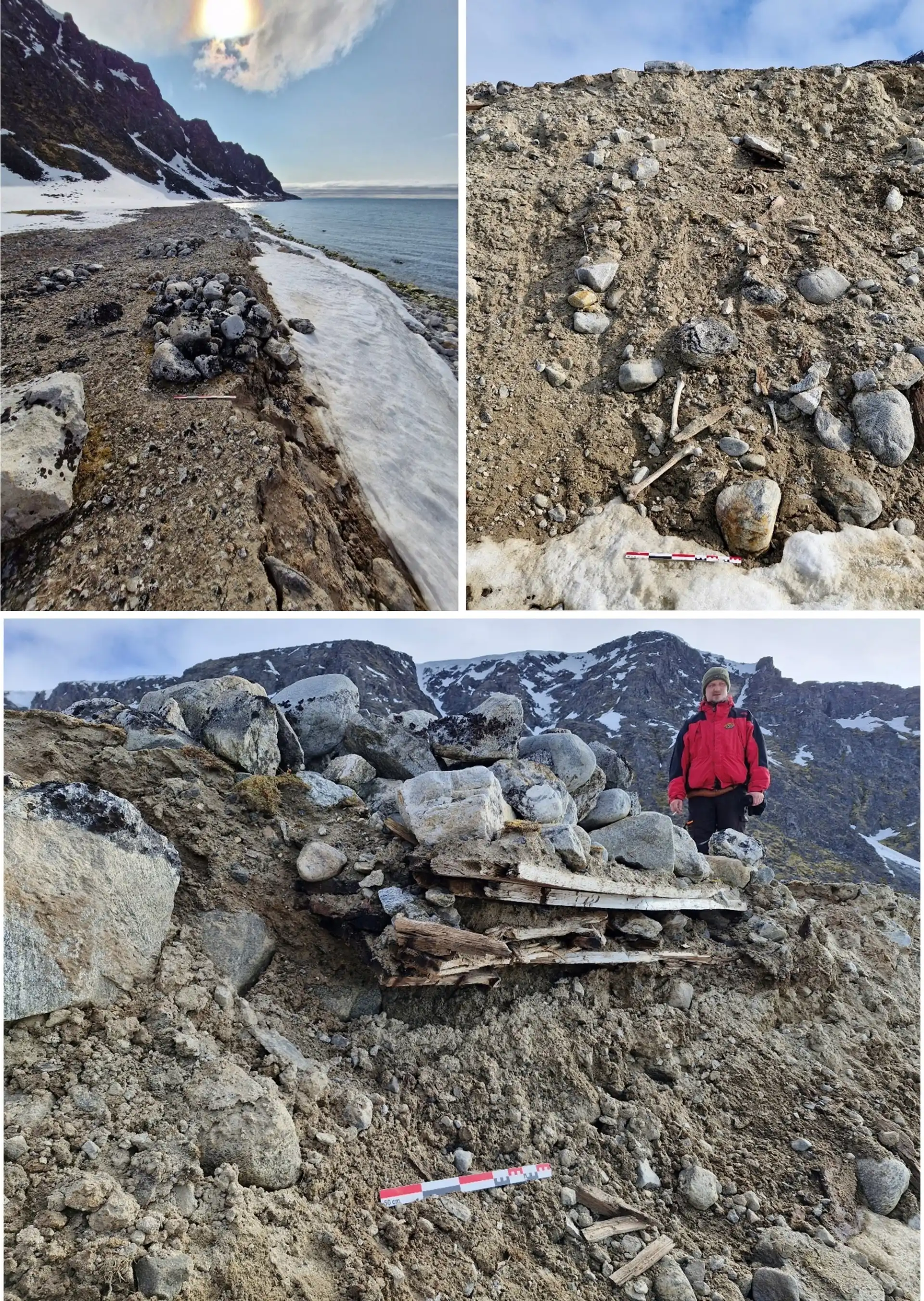 Billeder fra et kort besøg på den dansk-norske hvalfangststation på Danskøya i sommeren 2025, viser hvordan permafrost optøning og erosion er ved at ødelægge gravpladsen. Foto Anatolijs Venovcevs, Svalbard Museum