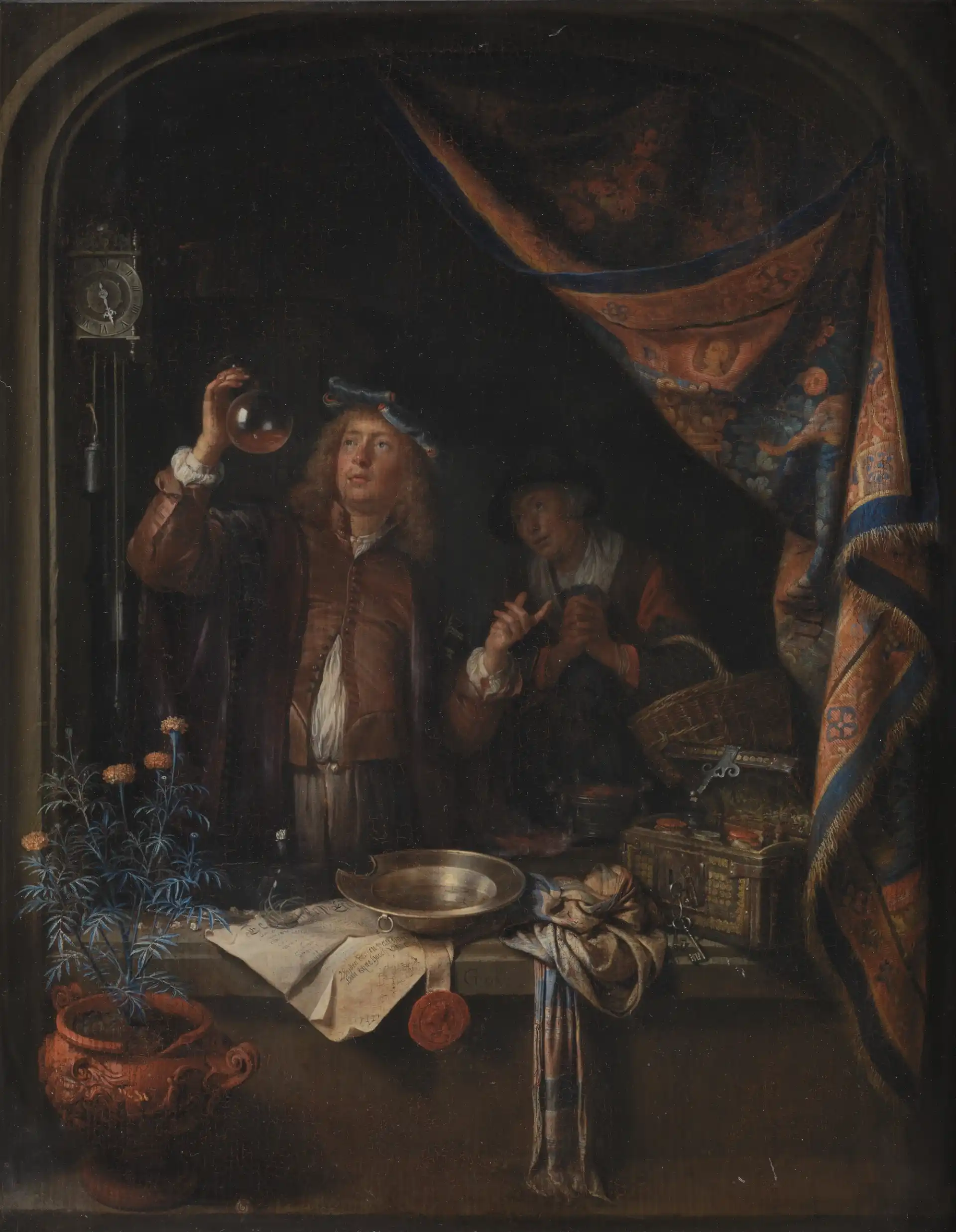 Gerard Dou, Besøg hos lægen, 1660-1665, Olie på træ, 38 x 30 cm, KMSsp451, Statens Museum for Kunst, open.smk.dk, public domain
